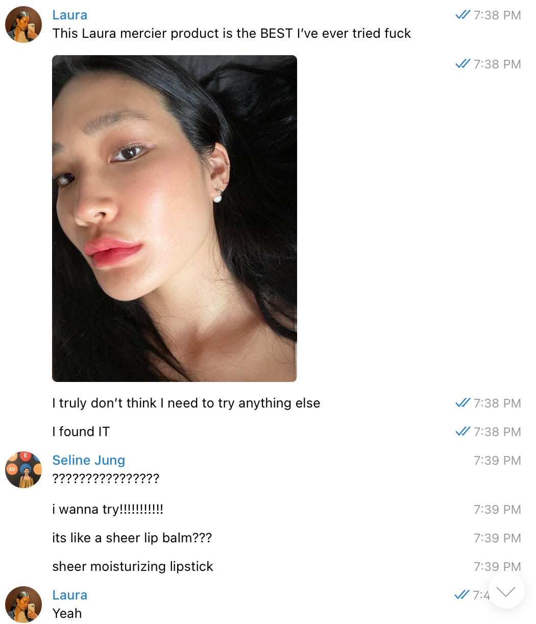 I discovered the most perfect lip product. The product is Laura Mercier’s Petal Soft Lip Crayon, a sheer, ultra-hydrating lipstick that reads more like a lip balm with the most easy application, perfect for someone who favors a low-maintenance beauty routine. And while my discovery of it was in part due to a sponsored advertisement I was running on my Instagram (please don’t let this deter you from my recommendation—keep reading!), I think I would have discovered it anyway. I’m always looking for a product like this! Glossier’s Gen G was once my favorite lip product because it was exactly that: a sheer, tinted lip balm type stick. But I found it a bit drying and the smell would go rancid pretty fast. So I’m really excited about this one. Here’s a screenshot of a text I sent my sister when I tried it on for the first time: