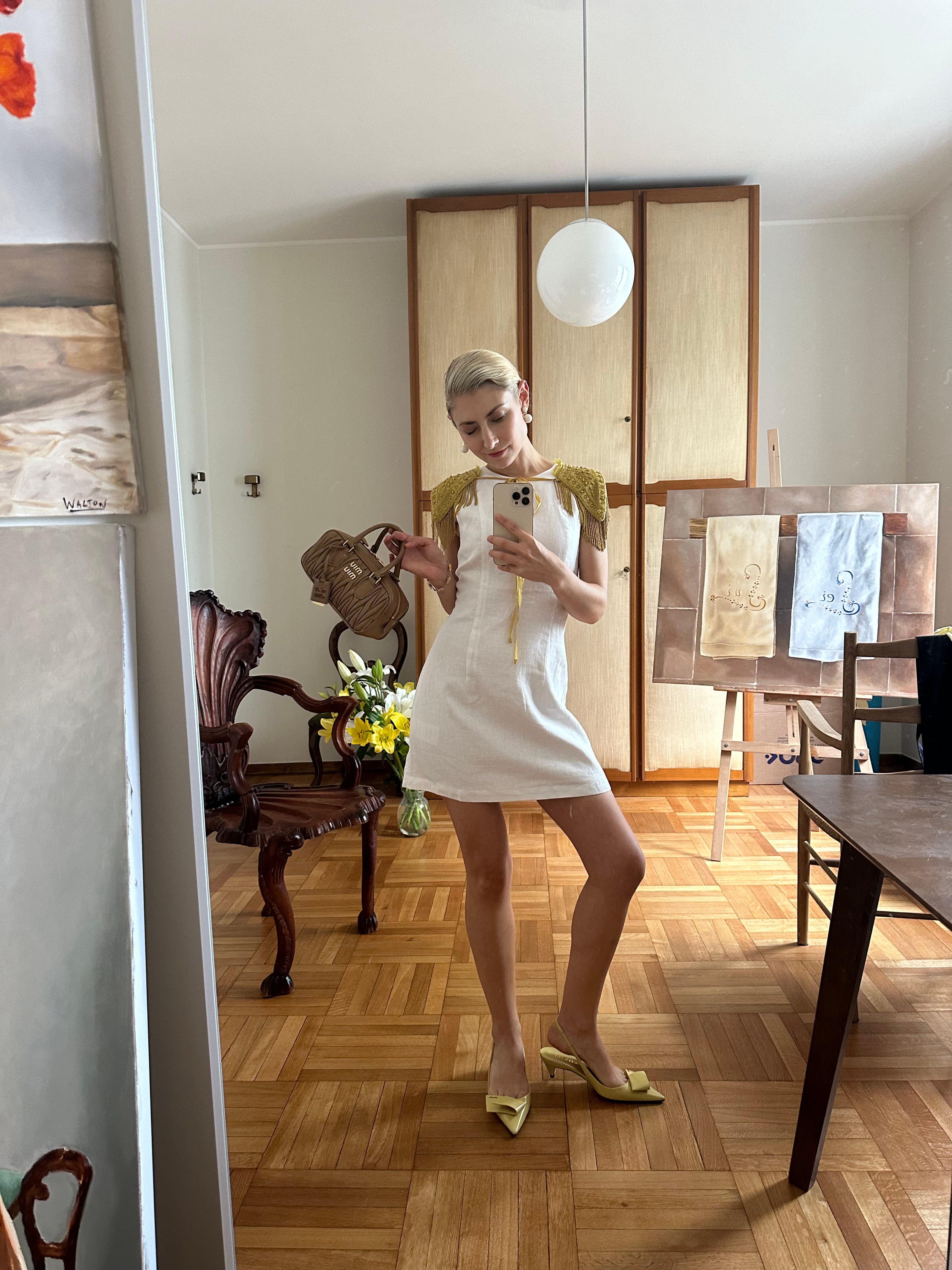 I bought this dress, after seeing Jenny Walton post it and it was quite possibly the fastest see-on-influencer-and-buy purchase I’ve made. The 100% linen composition, mini length paired with a modest neckline, slight A-line silhouette all make it the perfect summer dress that can be dressed up and down, day to night. It’s the perfect thought starter to summer dressing and I’m sooo excited for shorter hemlines and the reintroduction to 100% linen and cotton pieces.