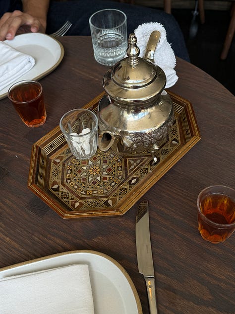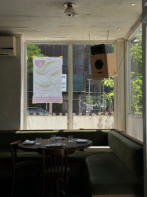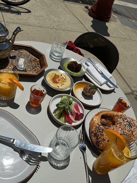 I went to this new Levantine (food of Lebanon, Syria, Palestine, Jordan) restaurant in Williamsburg called Huda that encapsulated everything I love about Brooklyn dining: sidewalk seating, a quiet corner, a real neighborhood feel with actually delicious food. I need to go back for their weekday menu but their weekend brunch set was so simple and beautifully presented and also vegetarian!!! They also host film screenings and live music on Sundays to highlight the local SWANA (southwest Asian & North African) creative community. You can see the schedule on their Instagram here. They are staunchly pro-Palestinian too, and eager to foster a sense of community amongst the SWANA community and allies. More places like this, please :)