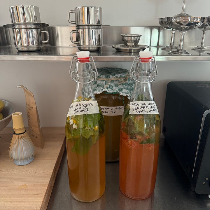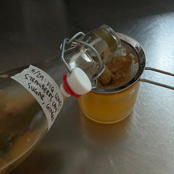 I made a beautiful summer kombucha with fig leaves, strawberries and ginger. And another with with lemon leaves and fresh chamomile flowers. One of the things I love about summer is its abundance in produce that allows you to get all creative at home. All! The! Flavor! Combinations! My recent kombucha making hobby has gotten out of control, so much so that my friends are now invested in my concoctions so that they, too, can experience this abundance. Go get some fresh strawberries and fig leaves at the farmer’s market. I’m not saying you should make kombucha but I’m saying you should do something, anything!